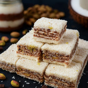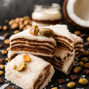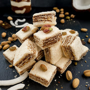 Kārtains vaniļas-šokolādes baudījums. Zem kokosa pārkaisījuma slēpjas vaniļas spilventiņš ar šokolādes krēmu "nutella". Iekšā ir lieli pistāciju gabaliņi. Pistāciju gabaliņi ir viegli apcepti, ar ļoti vieglu sāļu pēcgaršu, maigi un kraukšķīgi. Šokolādes slānis ir biezs un ļoti gards. Lukums izskatās pēc mazas kūciņas!