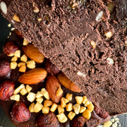 Halva ar bagātīgu šokolādes garšu (kerobs + kakao). Halvas pildījums no lazdu riekstiem, mandelēm un zemesriekstiem. Katrs gabals ir pārklāts ar šokolādes glazūras kārtu un dekorēts ar rīvētām pistācijām un sasmalcinātiem zemesriekstiem.